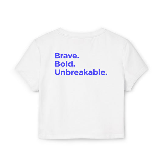 Backtalk Crop - Brave, Bold, Unbreakable (White/Blue Text)